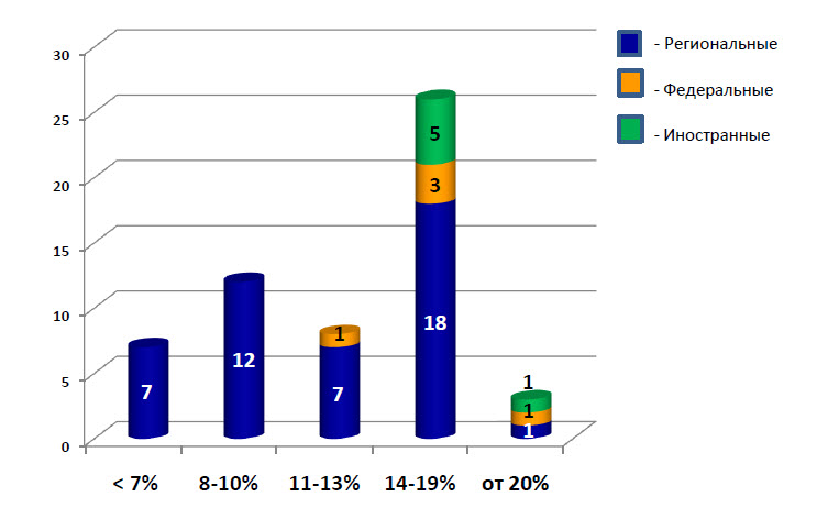 Поскольку многие агентства указывают диапазон по стоимости оказываемых услуг, мы взяли во внимание среднийпроцент за подбор персонала по услуге «Рекрутмент».По сравнению с предыдущим годом стоимость услуг немного выросла, бÓльшее количество сосредоточилось в сегменте от 14 до 19% от годового дохода.